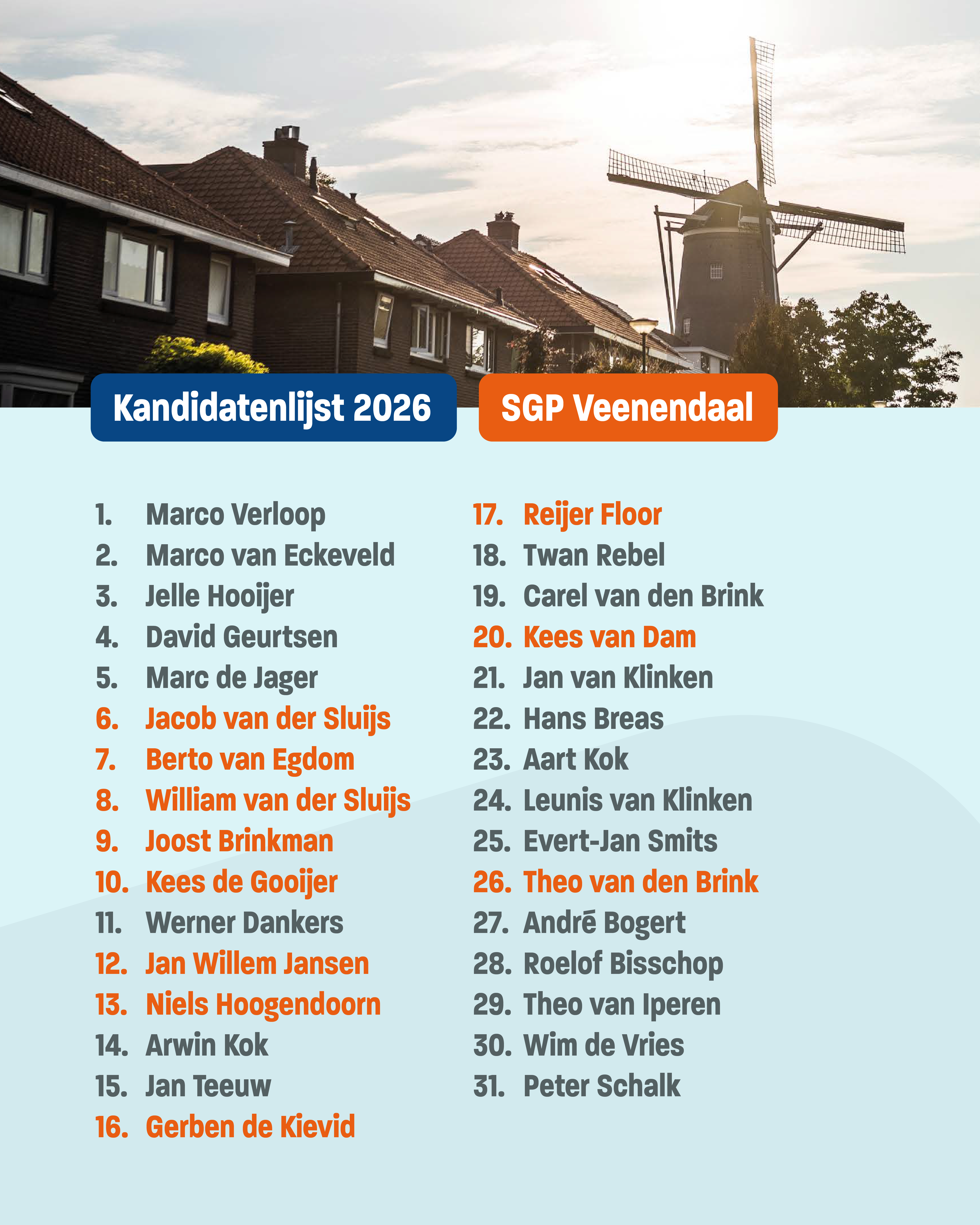 De lijst wordt aangevoerd door wethouder Marco Verloop, fractievoorzitter Marco van Eckeveld en raadslid Jelle Hooijer. Eerste Kamerlid Peter Schalk sluit de lijst af.