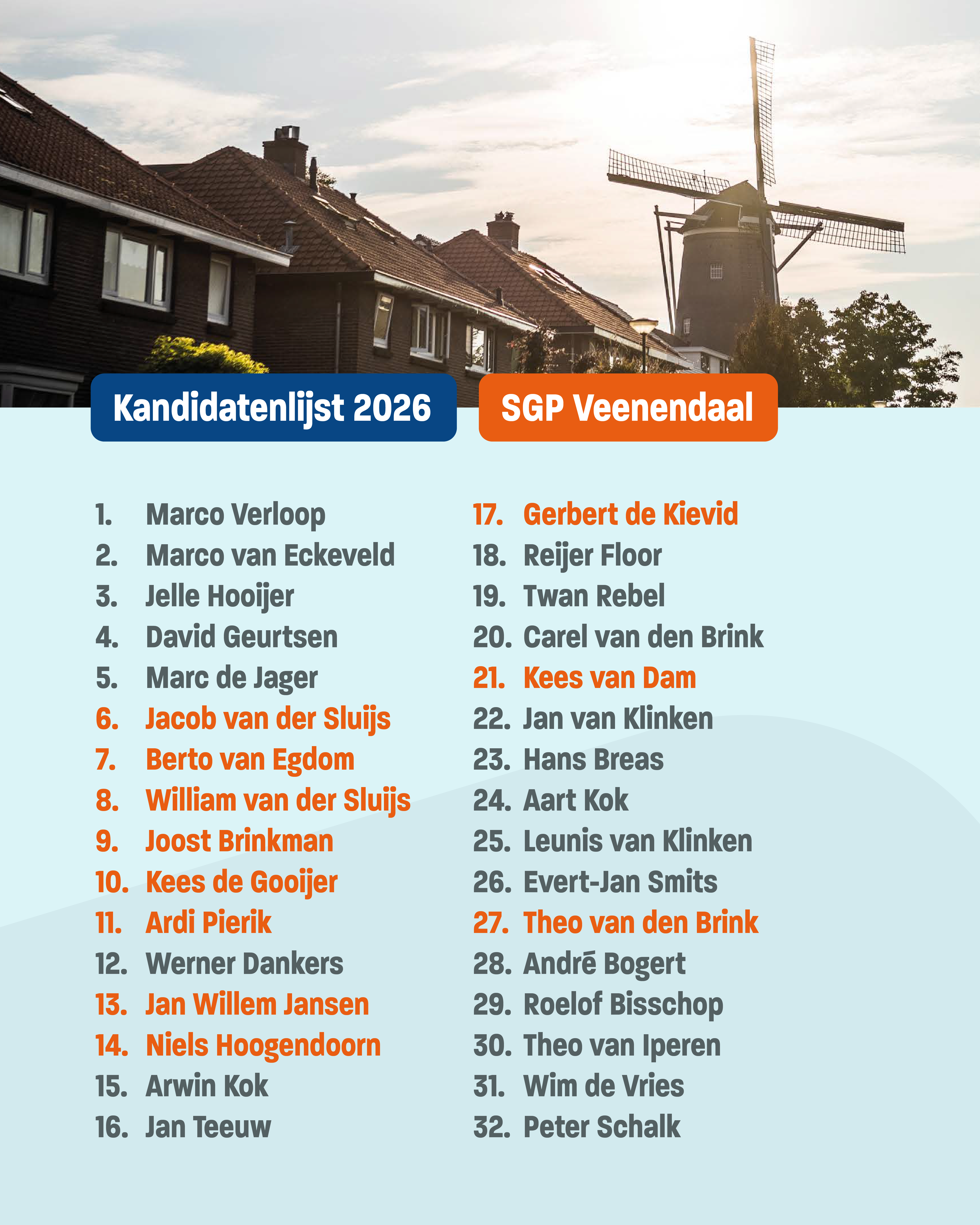 Tijdens de bestuursvergadering van 25 november 2025 heeft het bestuur van SGP Veenendaal de kandidatenlijst voor de gemeenteraadsverkiezingen van 2026 vastgesteld. We zijn dankbaar dat we elf nieuwe gezichten op de lijst hebben kunnen opnemen, waarvan vijf nieuwe kandidaten in de top tien.